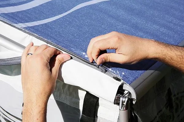 Caravanstor XL ZIP (NY model) posemarkise er forsynet med lynlås på siderne af markisedugen. Markisen er således forberedt til dette Caravanstore ZIP telt – som indeholder 2 sider og front