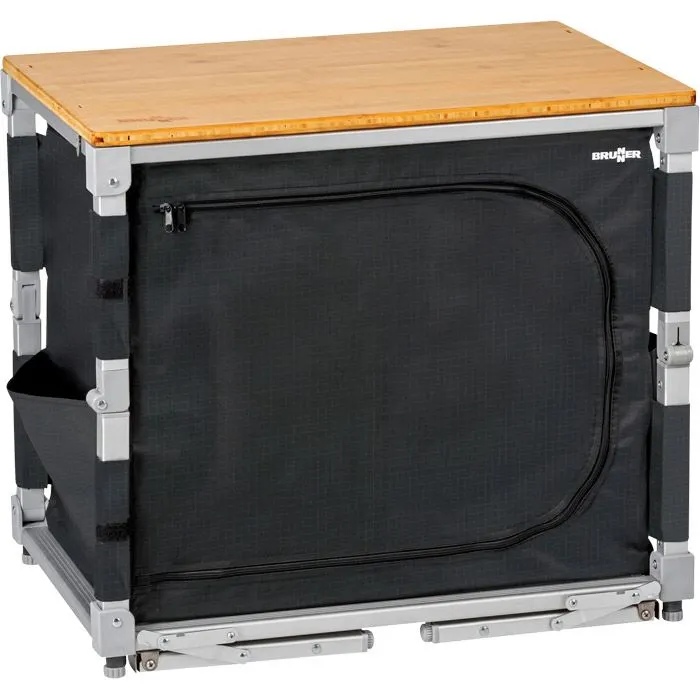 Kompakt og sammenfoldeligt campingskab med justérbare fødder og arbejdsbord i bambus.